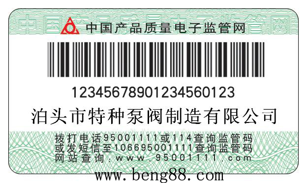 泊頭市特種泵閥制造有限公司自2008年5 月1 日出廠的產(chǎn)品,在產(chǎn)品合格證上粘貼長(zhǎng)方形監(jiān)管碼標(biāo)簽,上有20位數(shù)字,這就是產(chǎn)品監(jiān)管碼。因此,我公司生產(chǎn)的每件產(chǎn)品都將有一個(gè)“電子身份證”??梢岳霉潭娫?、手機(jī)短信、互聯(lián)網(wǎng)、超市終端等網(wǎng)絡(luò)通訊設(shè)備對(duì)電子監(jiān)管碼進(jìn)行查詢,辨別真?zhèn)?。查詢辦法如下: